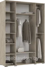 Внутри шкафа предусмотрена широкая штанга для вешалок с одеждой, а боковые полки предназначены для хранения различных предметов и аксессуаров. Верхняя часть шкафа, антресоль, разделена на три секции, что позволяет удобно организовать хранение несезонной одежды или редко используемых вещей. Для обеспечения устойчивости и надежности конструкции шкаф установлен на опоры черного цвета.